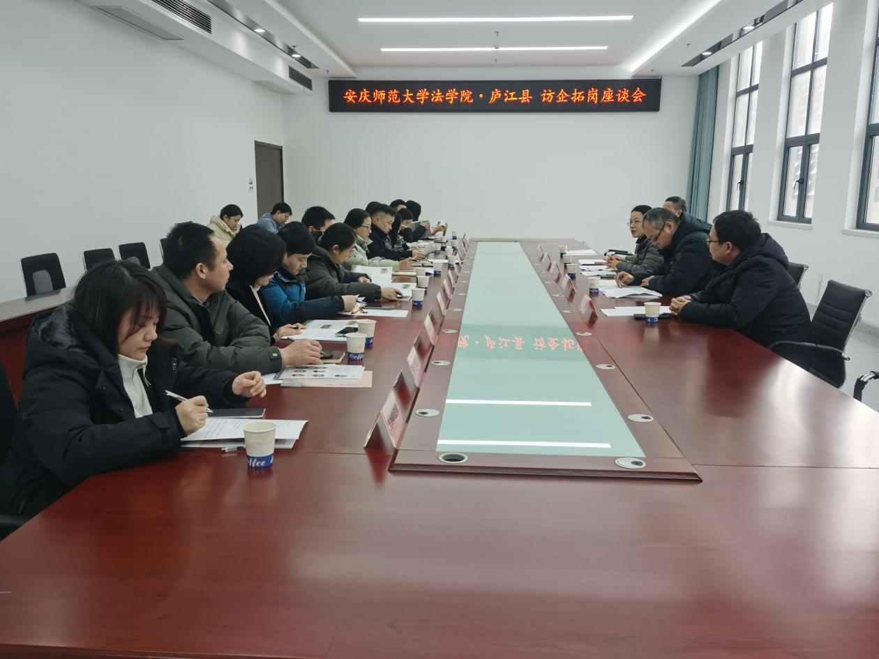 2月3日,法学院党委书记钱敏、院长崔汪卫、党委副书记卫功兵、副院长邱少晖、校友分会秘书长李丹等一行5人赴庐江县开展访企拓岗促就业专项调研,并在庐江县工投产业园服务中心召开交流座谈会。庐江县科技局副局长方峥,县科技局党组成员、县科创中心主任卢中品,安徽剑戈律师事务所、中科云控智能装备制造有限公司、安徽新合富力科技有限公司等10余家企业代表参加座谈会。会议由卢中品主持。